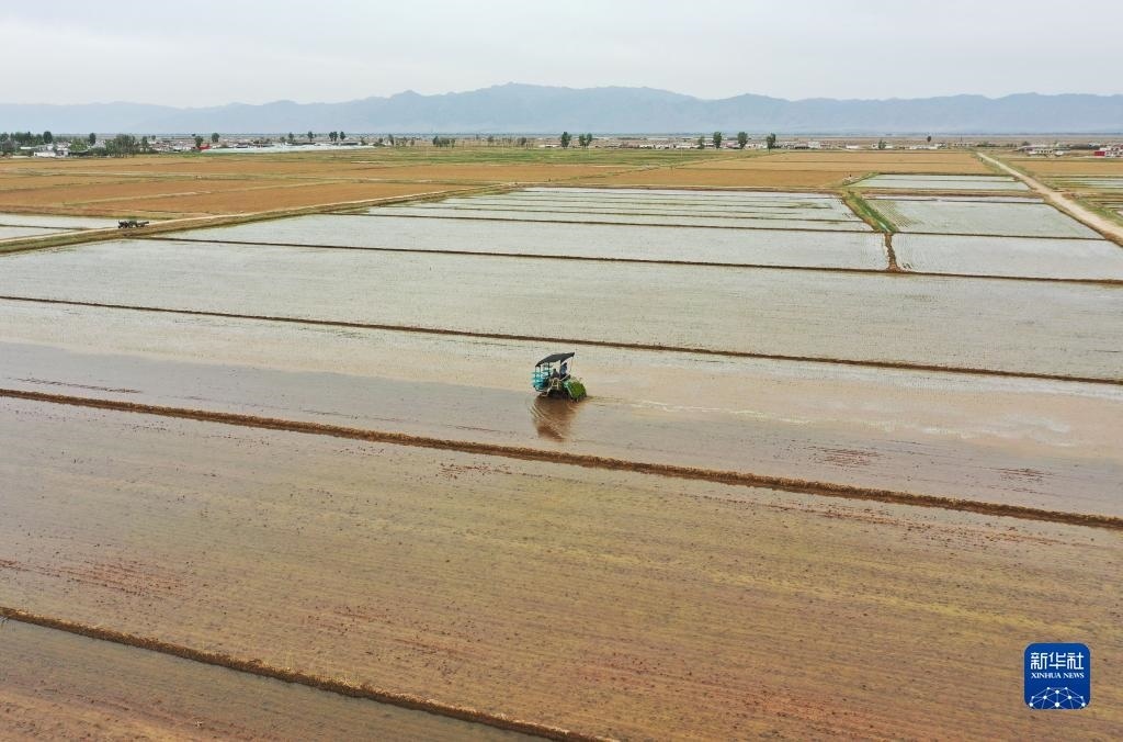 5月23日,達(dá)拉特旗昭君鎮(zhèn)村民在鹽堿地改良水稻田中使用農(nóng)機(jī)插秧。