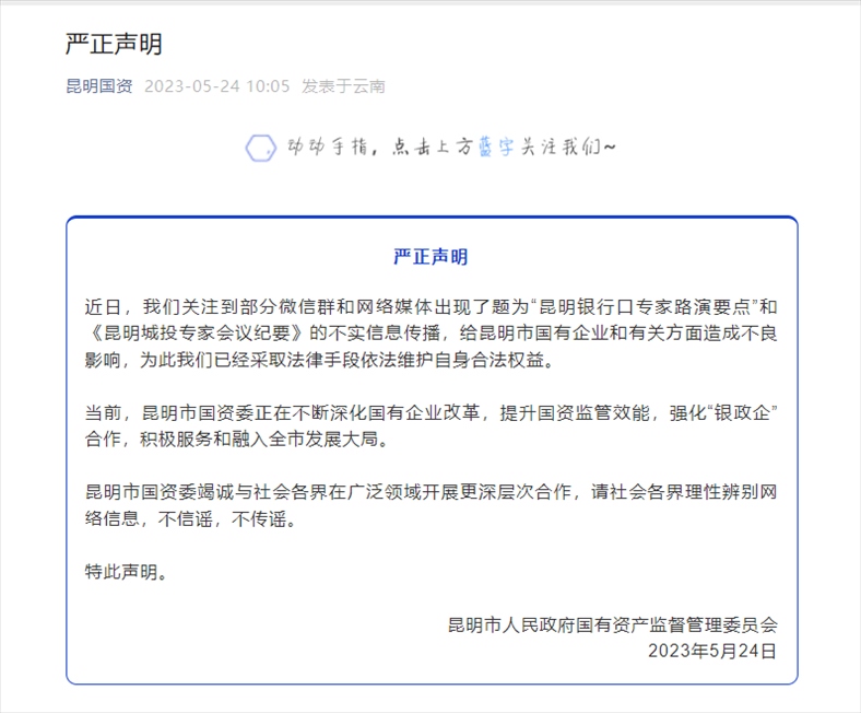 ·昆明市國資委發(fā)布聲明,“昆明銀行口專家路演要點(diǎn)”和《昆明城投專家會(huì)議紀(jì)要》不實(shí)。