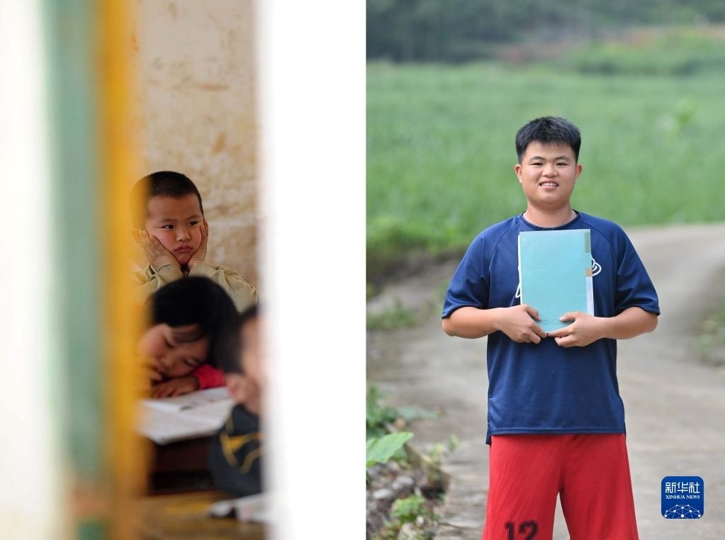 拼版照片:左圖為2012年3月27日,在大化瑤族自治縣大化鎮(zhèn)仁良小學(xué),6歲的韋康濤在教室里上課(新華社記者黃孝邦攝);右圖為在大化瑤族自治縣高級(jí)中學(xué)讀高二的韋康濤(新華社記者胡星宇 2023年5月21日攝)。韋康濤的夢(mèng)想是考上理想的大學(xué)。   新華社發(fā)