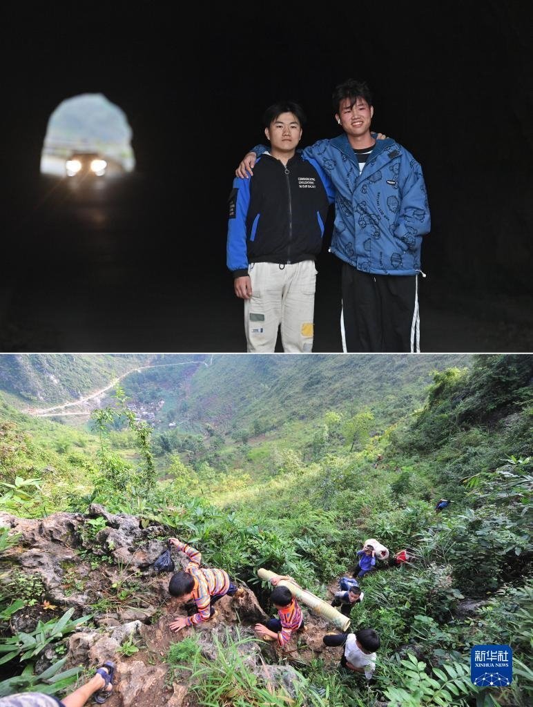 拼版照片:上圖為2023年1月20日,在大化瑤族自治縣板升鄉(xiāng)弄勇村,22歲的蒙宣任(左)和弟弟蒙宣汰站在通往弄勇小學(xué)的隧道旁合影,隧道上方是他們兒時(shí)上學(xué)需要攀爬的“天梯”;下圖為2012年9月3日,在大化瑤族自治縣板升鄉(xiāng)弄勇村,蒙宣汰(左一)、蒙宣任(左二)爬山路去學(xué)校。蒙宣任目前在遼寧省交通高等??茖W(xué)校讀書,弟弟蒙宣汰從技校畢業(yè)后在廣東一家汽修廠上班。   新華社記者 黃孝邦 攝