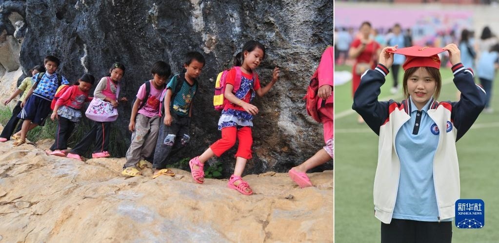拼版照片:左圖為2012年9月3日,在大化瑤族自治縣板升鄉(xiāng)弄雷村,8歲的蒙麗丹(右一)爬懸崖去學(xué)校讀書;右圖為2023年5月20日,蒙麗丹在廣西大化瑤族自治縣高級(jí)中學(xué)高三成人禮上(新華社記者胡星宇攝)。即將參加高考的蒙麗丹,希望以后能回到大山里當(dāng)老師。   新華社發(fā)