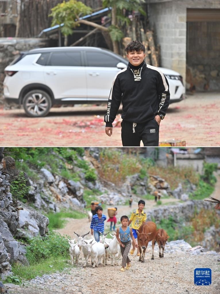 拼版照片:上圖為2023年1月21日,在大化瑤族自治縣板升鄉(xiāng)弄勇村,22歲的蒙宣朝站在自己剛剛購(gòu)買的汽車前;下圖為2012年7月16日,在大化瑤族自治縣板升鄉(xiāng)弄勇村,11歲的蒙宣朝(前)利用暑假幫家里放牧。技校畢業(yè)后,蒙宣朝到廣東工作。   新華社記者 黃孝邦 攝