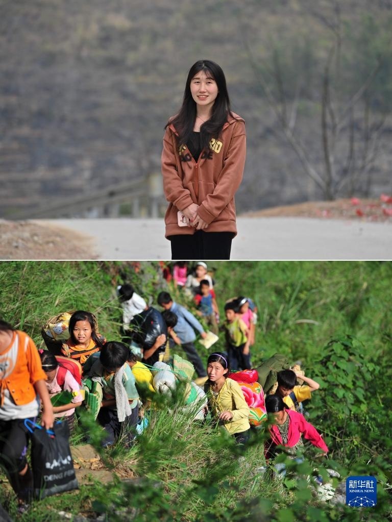 拼版照片:上圖為2023年1月21日,在大化瑤族自治縣板升鄉(xiāng)弄勇村,大專畢業(yè)后在廣州工作的藍(lán)秋艷回家過年時(shí)在家門口留影;下圖為2012年7月4日,學(xué)校放假后,11歲的藍(lán)秋艷(著黃衣者)背著生活用具,走在回家的山路上。22歲的藍(lán)秋艷正在努力考取教師資格證。   新華社記者 黃孝邦 攝