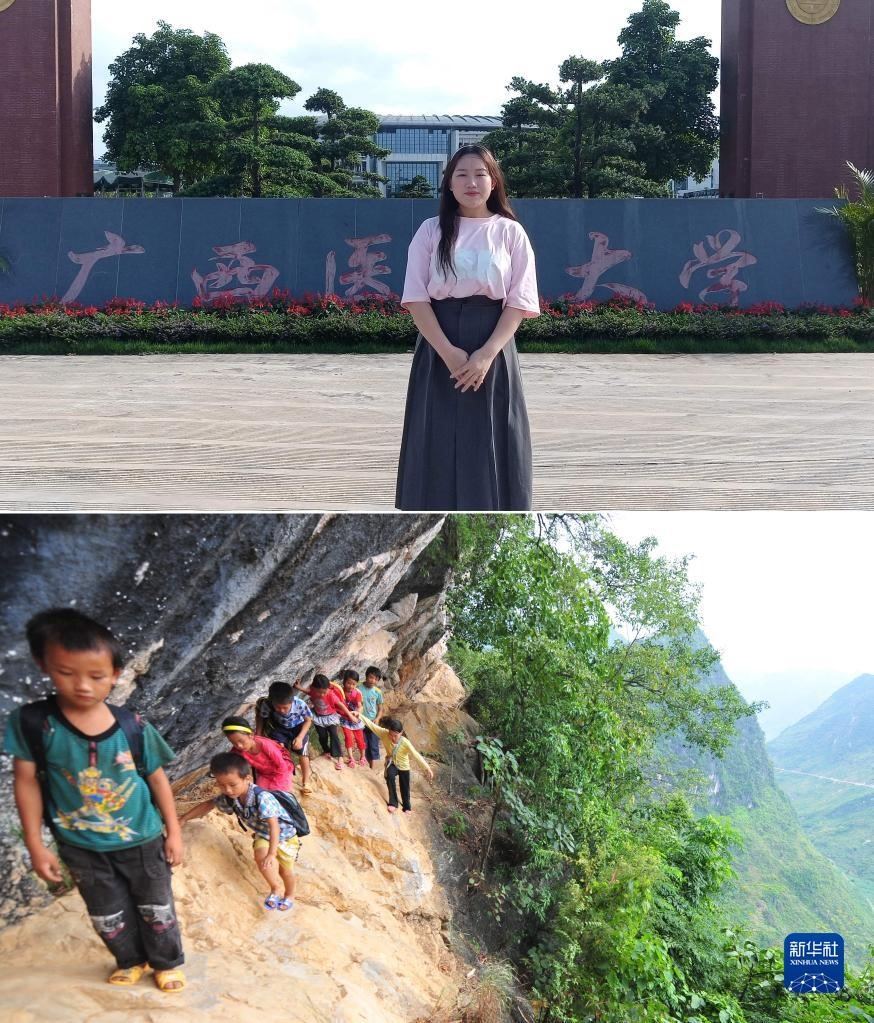 拼版照片:上圖為2023年5月27日,22歲的蒙秋艷站在她就讀的廣西醫(yī)科大學(xué)校門口(新華社發(fā));下圖為2012年9月3日,在大化瑤族自治縣板升鄉(xiāng)弄雷村哈保屯,11歲的蒙秋艷(右一)在懸崖邊護(hù)著低年級(jí)的小伙伴回家(新華社記者黃孝邦攝)。2021年,蒙秋艷以優(yōu)異的成績(jī),考取廣西醫(yī)科大學(xué)。   新華社發(fā)
