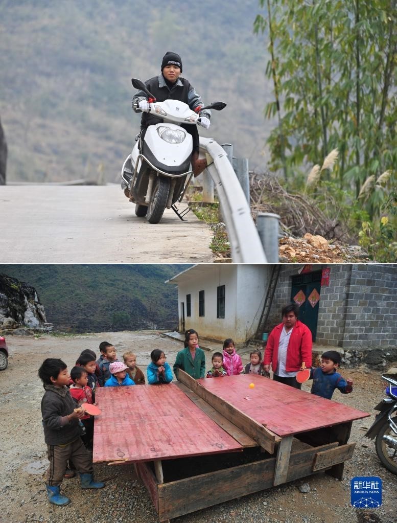 拼版照片:上圖為2023年1月26日,在大化瑤族自治縣板升鄉(xiāng)弄勇村,在廣東工作、返鄉(xiāng)過年的蒙宣海在路邊休息;下圖為2012年12月27日,在弄勇村弄頂教學(xué)點(diǎn),7歲的蒙宣海(右一)在打乒乓球。2022年,蒙宣海技校畢業(yè)后,選擇去廣東工作。   新華社記者 黃孝邦 攝