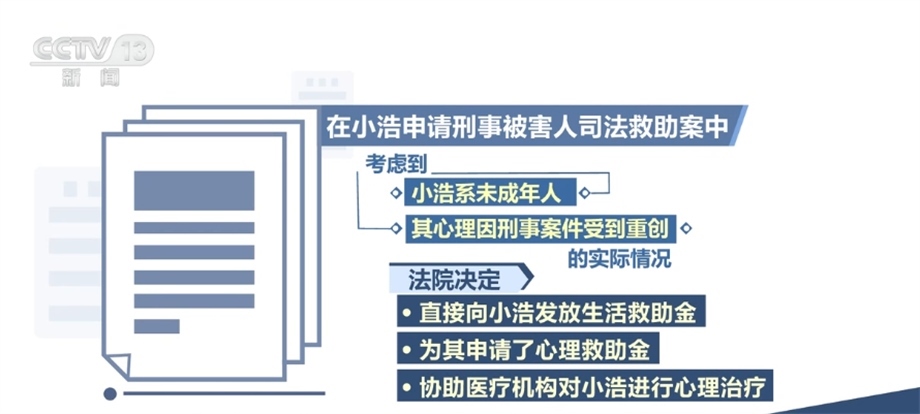 在此次發(fā)布的保護(hù)未成年人權(quán)益司法救助典型案例中,還涉及針對向未成年人提供專門心理救助金、提供心理危機干預(yù)等立體幫扶,進(jìn)一步延伸司法服務(wù)。在小浩申請刑事被害人司法救助案中,小浩的父親被害,其本人亦受到人身傷害,法院作出刑事附帶民事判決,判處被告人死刑,并判決其賠償附帶民事訴訟原告人經(jīng)濟(jì)損失13萬余元。后經(jīng)調(diào)查,被告人無財產(chǎn)可供執(zhí)行。考慮到小浩系未成年人,其心理因刑事案件受到重創(chuàng)的實際情況,法院除決定直接向小浩發(fā)放生活救助金外,還為其申請了心理救助金,協(xié)助醫(yī)療機構(gòu)對小浩進(jìn)行心理治療。