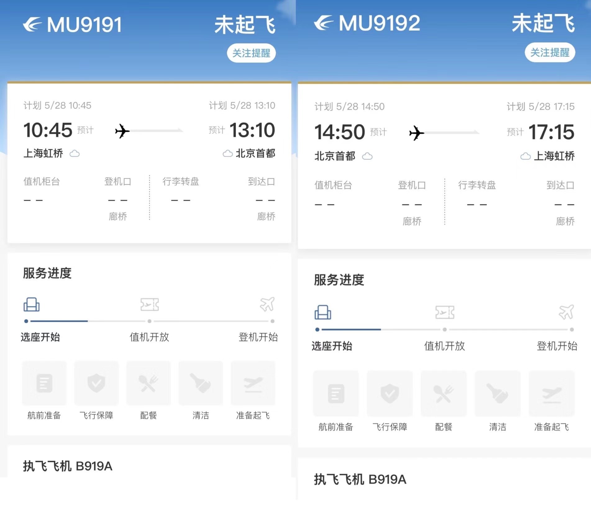此外,5月26日稍早些,澎湃新聞?dòng)浾咴跂|航APP上查詢發(fā)現(xiàn),東航C919首個(gè)商業(yè)航班飛行計(jì)劃公布,班次為5月28日MU9191上海虹橋-北京首都,MU9192北京首都-上海虹橋,計(jì)劃飛行時(shí)長(zhǎng)2小時(shí)25分鐘。