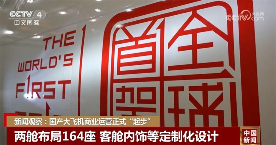 今天執(zhí)行商業(yè)首飛的C919飛機為164座兩艙布局,公務(wù)艙8座,經(jīng)濟艙156座??团搩?nèi)飾、旅客座椅、機載娛樂系統(tǒng)和飛機外部涂裝做了定制化設(shè)計。機身前部印有“全球首架”的“中國印”標(biāo)識和對應(yīng)英文。飛機注冊號B-919A,“B”代表飛機的中國國籍,“919”和型號名稱契合,“A”則有首架之意,突顯這一全球新機型、全球首架的非凡意義。