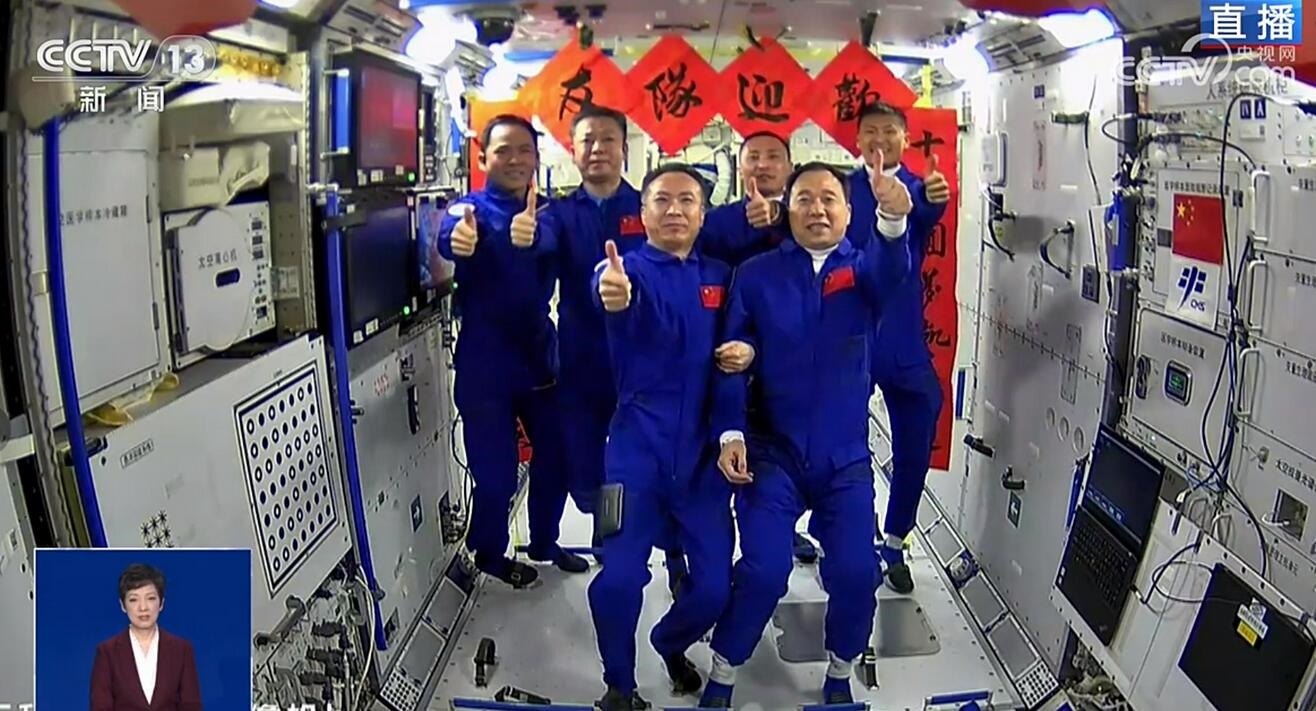 央視網(wǎng)消息:宇宙星河浪漫,探索永不止步。今天(5月30日)9時(shí)31分,搭載神舟十六號(hào)載人飛船的長(zhǎng)征二號(hào)F遙十六運(yùn)載火箭在酒泉衛(wèi)星發(fā)射中心點(diǎn)火發(fā)射,發(fā)射任務(wù)取得圓滿成功。神舟十六號(hào)航天員景海鵬、朱楊柱、桂海潮順利進(jìn)入太空。神舟十六號(hào)載人飛船入軌后,在16時(shí)29分成功對(duì)接于空間站天和核心艙徑向端口。之后,神舟十六號(hào)航天員乘組從飛船返回艙進(jìn)入軌道艙。翹盼已久的神舟十五號(hào)航天員乘組打開(kāi)“家門(mén)”,歡迎遠(yuǎn)道而來(lái)的神舟十六號(hào)航天員乘組入駐“天宮”。