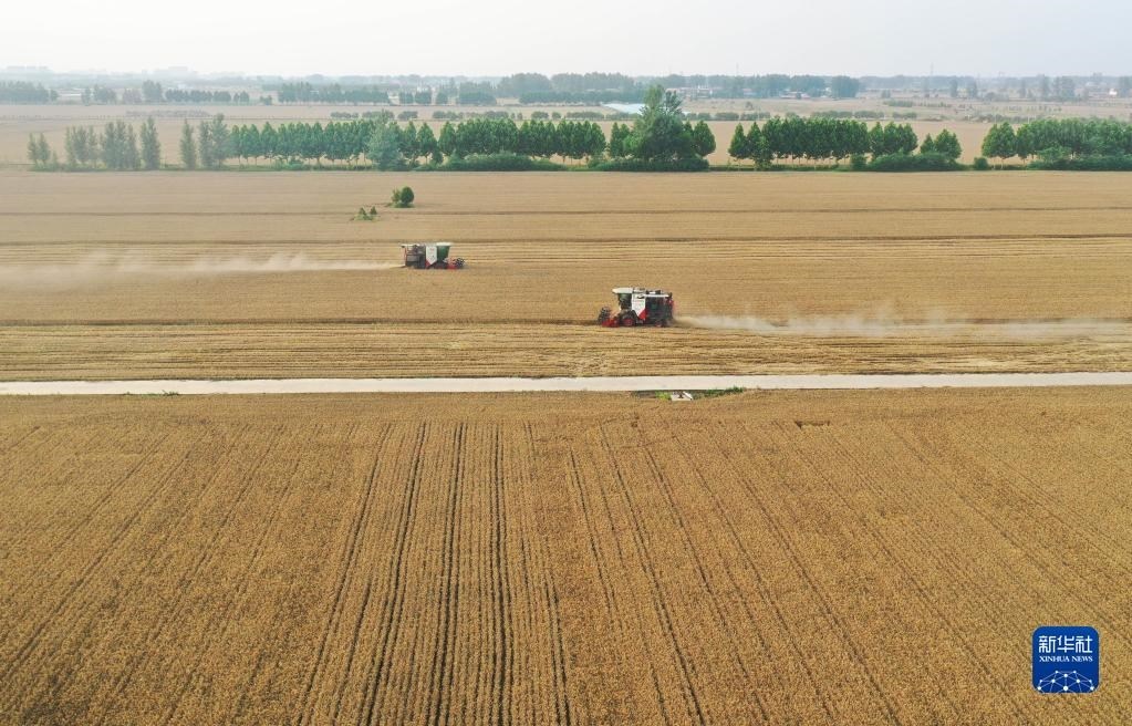 6月1日,在河南省駐馬店市上蔡縣邵店鎮(zhèn)后楊村,收割機(jī)在搶收小麥(無(wú)人機(jī)照片)。新華社記者 張浩然 攝