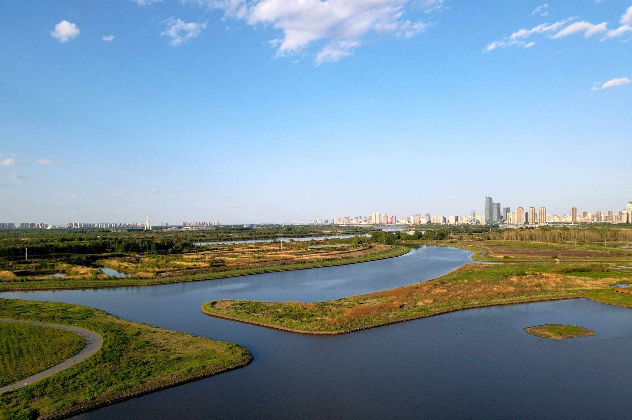 2023年5月30日,哈爾濱,松花江畔,外灘濕地中,“靴子”小島草木茂盛,綠意盎然。視覺中國
