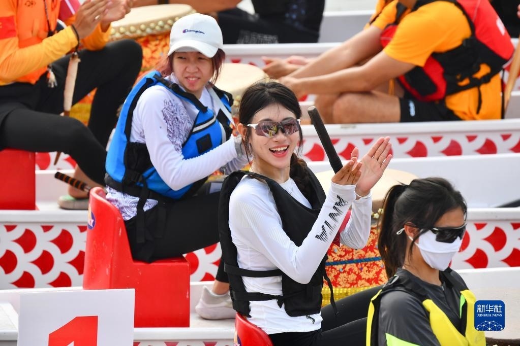 6月3日,來自臺(tái)灣的張宇?。ㄓ遥┦堑谒拇蝸韰⒓蛹例堉圪悾瑢?duì)比賽場(chǎng)地集美龍舟池“既熟悉,又親切”。   新華社記者 付敏 攝
