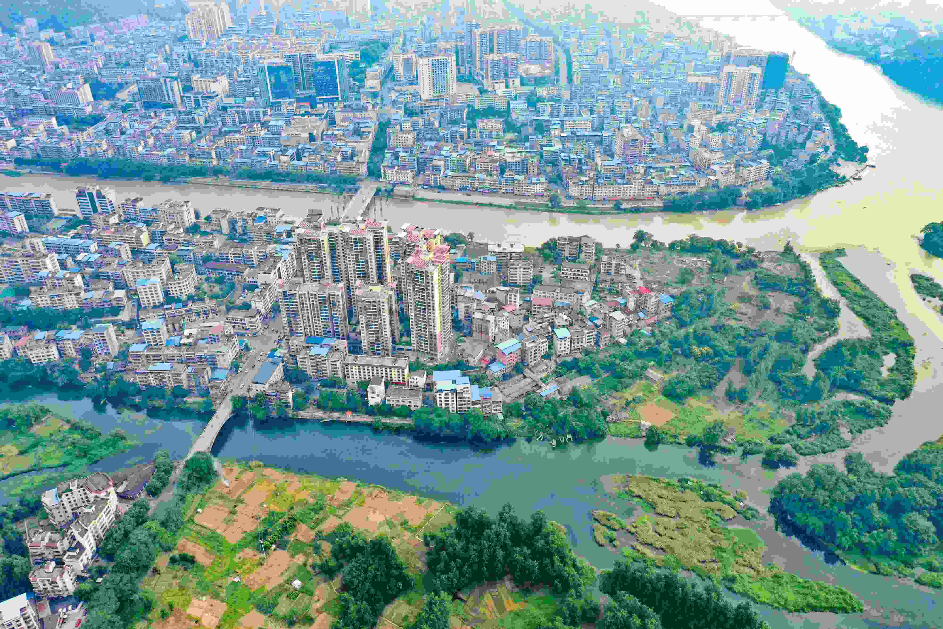 2023年6月4日,受降雨影響,廣西桂林全州縣城湘江河段出現(xiàn)涇渭分明景觀。空中俯瞰,湘江支流萬(wàn)鄉(xiāng)河混濁的河水繞城匯入清澈的湘江干流,交匯之處涇渭分明。 視覺中國(guó)