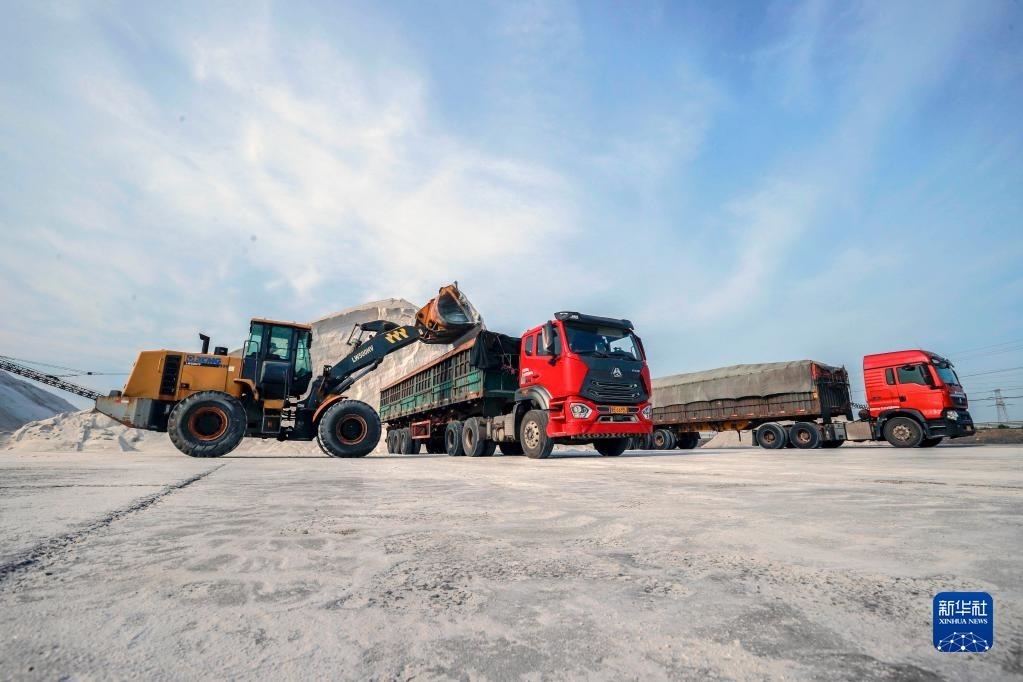 6月4日,工人操作設備在唐山海港經濟開發(fā)區(qū)長蘆大清河鹽場將海鹽裝車,準備外運。   新華社發(fā)(劉滿倉 攝)