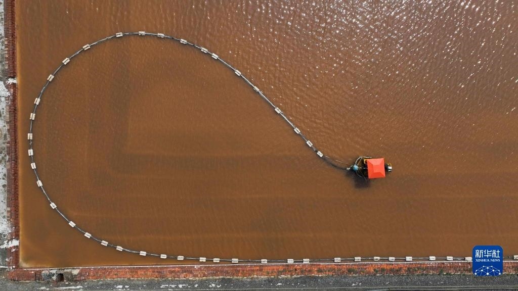6月4日,工人操作設備在唐山海港經濟開發(fā)區(qū)長蘆大清河鹽場收獲海鹽(無人機照片)。   新華社發(fā)(李磊 攝)