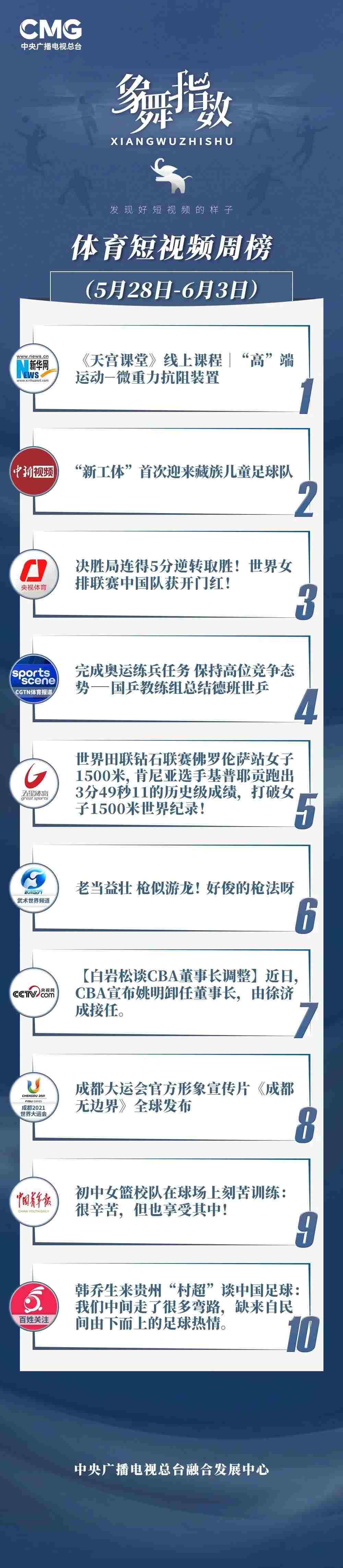 中央廣播電視總臺(tái)“象舞指數(shù)”評(píng)議品牌,推出體育短視頻周榜、總臺(tái)體育短視頻周榜。在5月28日—6月3日,以下內(nèi)容獲得矚目: