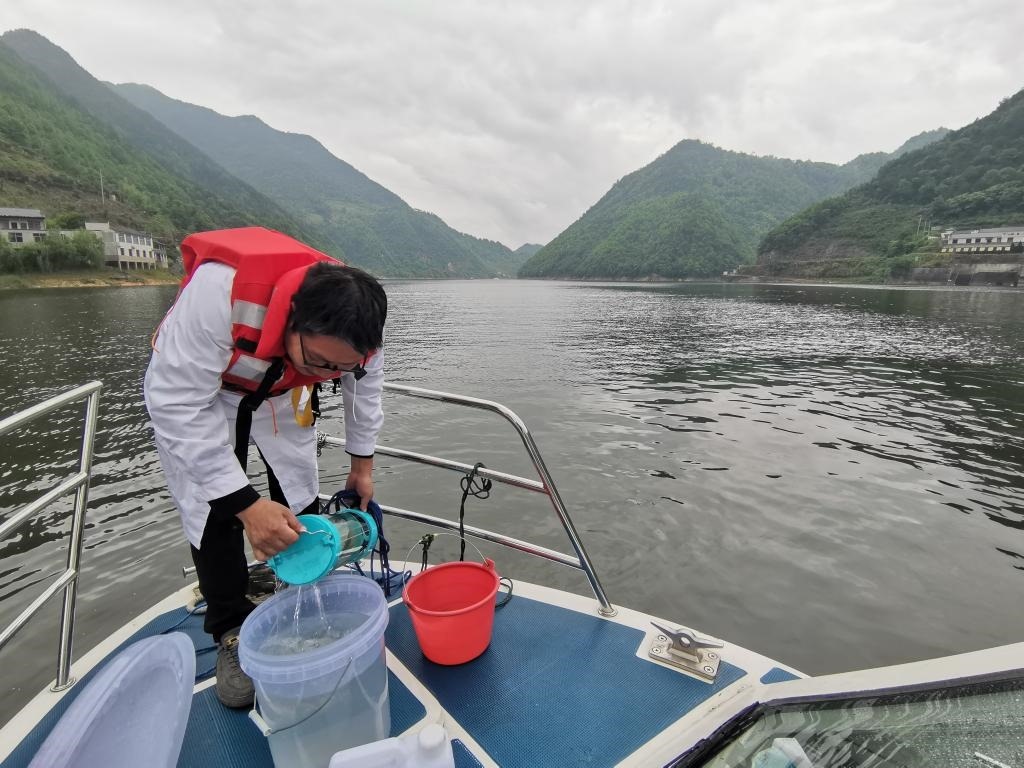 放下深水取樣器,待其沉入水下5米左右,再上提取水……近日,在新安江皖浙交界處,記者跟隨生態(tài)環(huán)保工作者乘船采樣、開展水質(zhì)監(jiān)測(cè)。