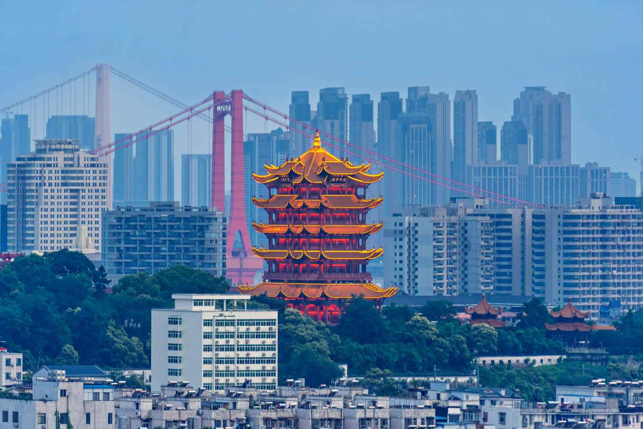 2023年6月8日,武漢,黃鶴樓與鸚鵡洲大橋同框。視覺(jué)中國(guó)