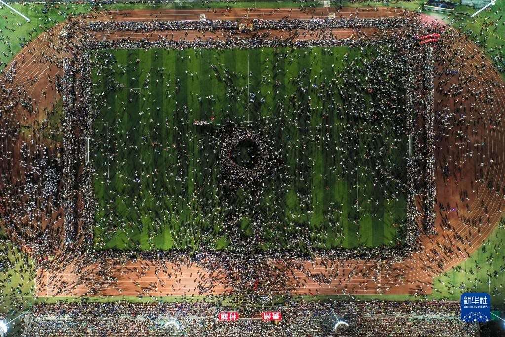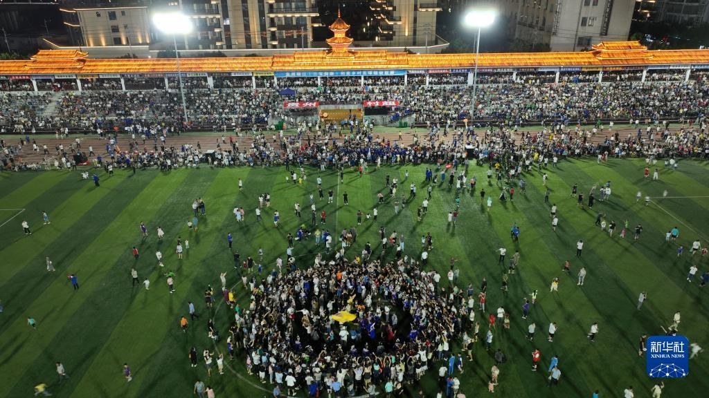 6月10日,演員在貴州“村超”足球比賽后表演民族舞蹈“多耶”,現(xiàn)場(chǎng)觀眾一起上場(chǎng)狂歡(無人機(jī)照片)。