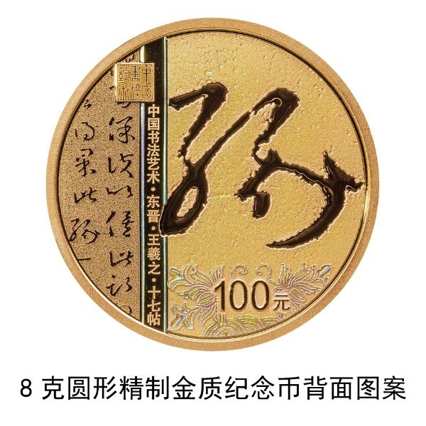 8克圓形金質(zhì)紀念幣背面圖案為東晉王羲之書《十七帖》局部文字及“緣”字樣與裝飾紋樣、“中國書法藝術(shù)”篆刻鈐印等組合設計,并刊“中國書法藝術(shù)·東晉·王羲之·十七帖”字樣及面額。