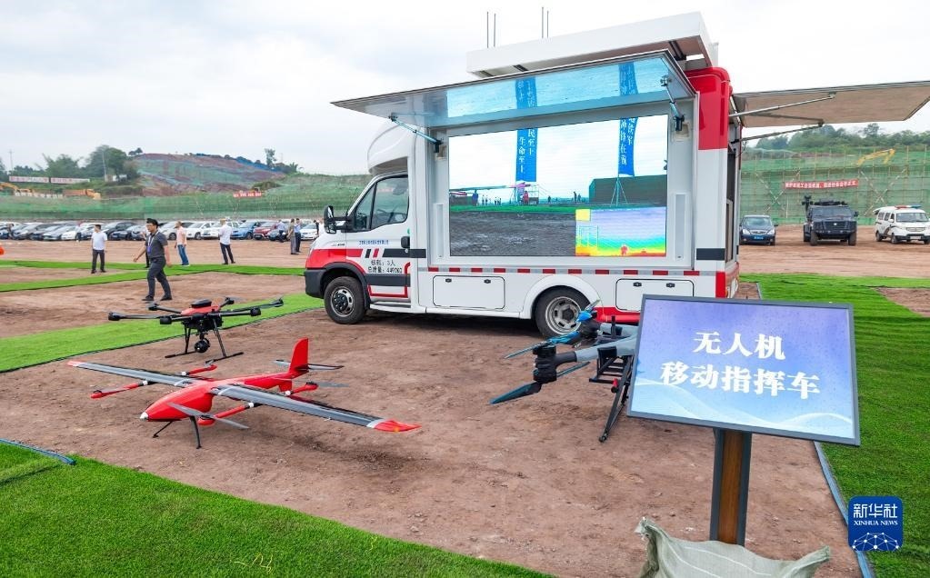 這是演練現(xiàn)場(chǎng)展示的無(wú)人機(jī)移動(dòng)指揮車(chē)(6月14日攝)。