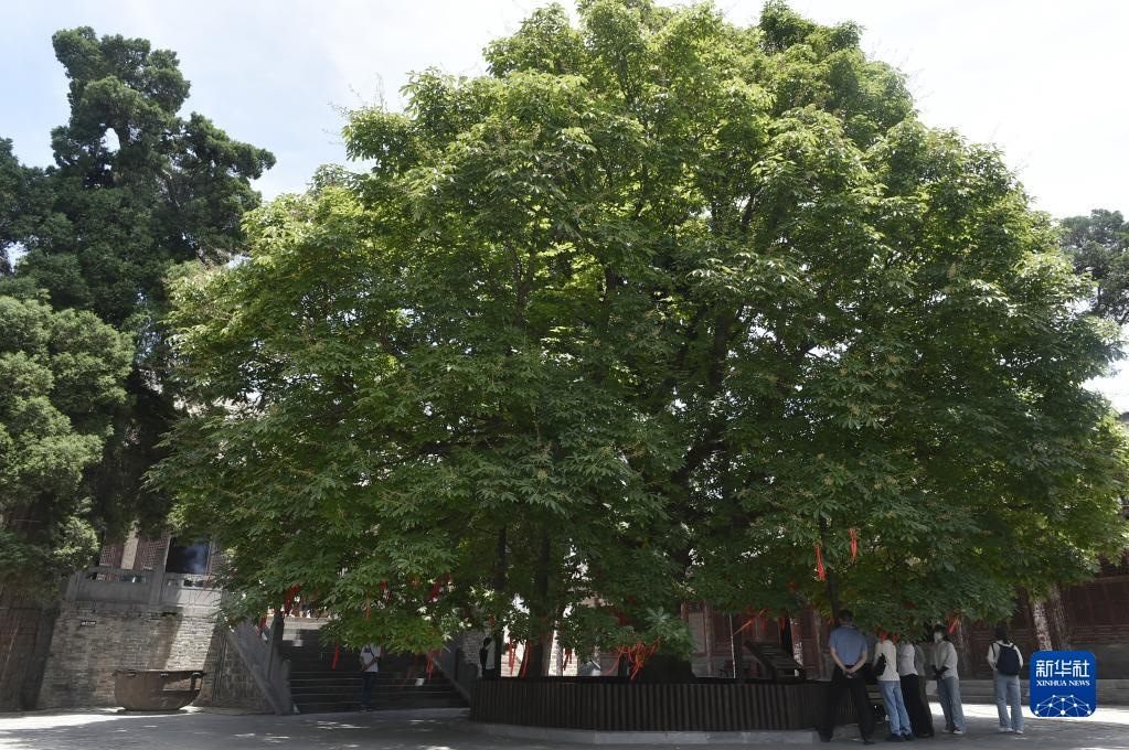 6月15日,游人在王屋山上參觀一棵古樹。