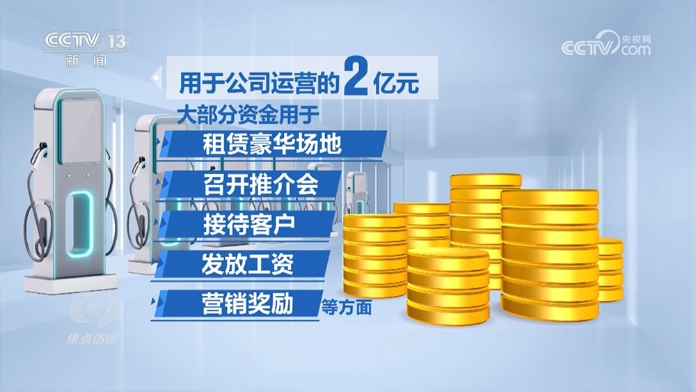 用于公司運(yùn)營(yíng)的2億元,大部分資金用于租賃豪華場(chǎng)地、召開(kāi)推介會(huì)、接待客戶、發(fā)放工資、營(yíng)銷獎(jiǎng)勵(lì)等方面。實(shí)際僅修建充電樁123個(gè),用資僅1000多萬(wàn)元,僅占資金總額的1%。