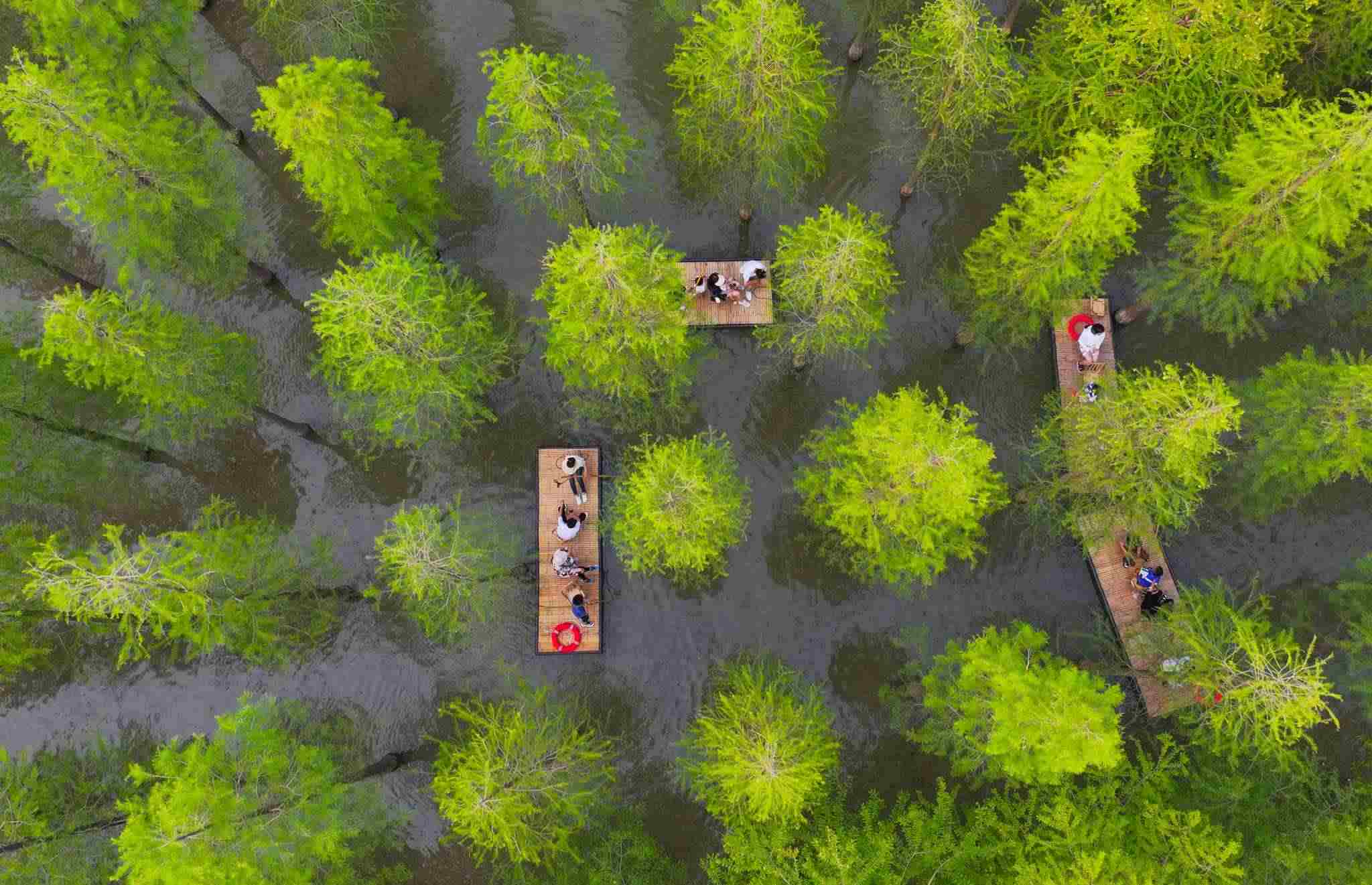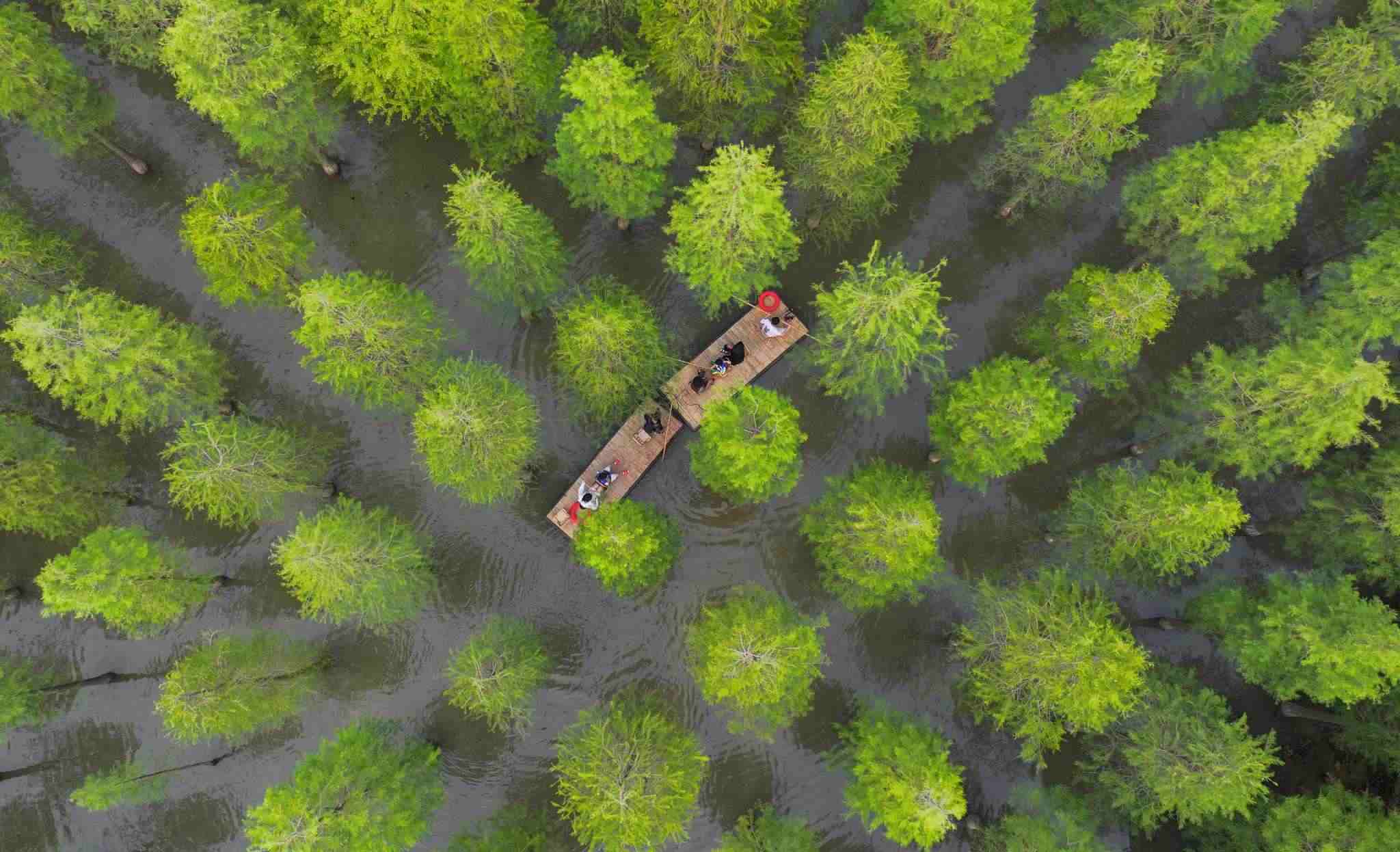 2023年6月16日,江蘇省宿遷市,泗洪縣洪澤湖濕地水杉林滿目蒼翠、郁郁蔥蔥,游客乘坐竹筏,在水杉林間穿梭游玩。視覺中國(guó)