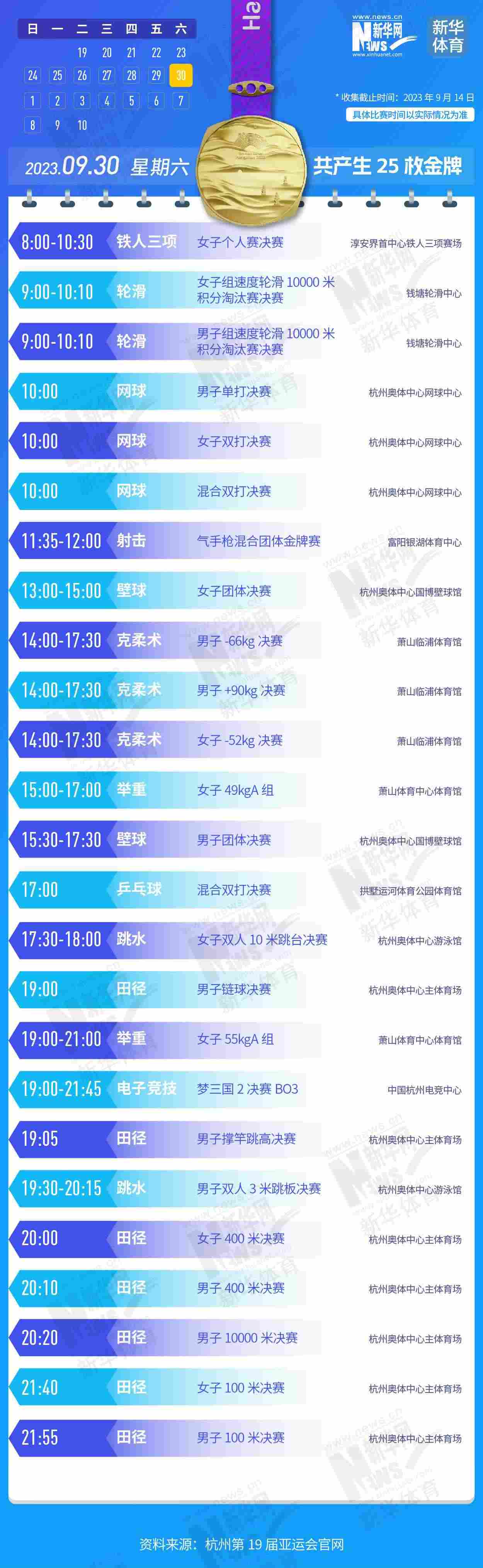 杭州第19屆亞運會即將開幕。本屆亞運會將產(chǎn)生481枚金牌,快收藏這份金牌賽事日歷,助你精準觀賽!