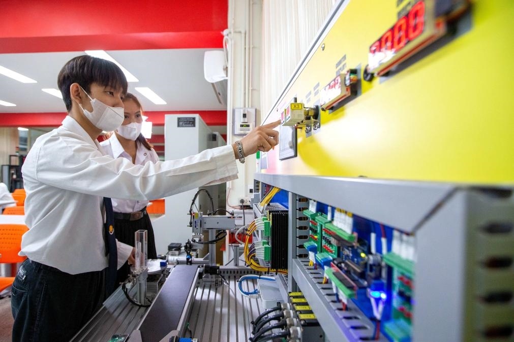 3月14日,在泰國大城府大城技術學院魯班工坊,學生在課堂上操作自動化生產線安裝調試系統(tǒng)。新華社記者 王騰 攝