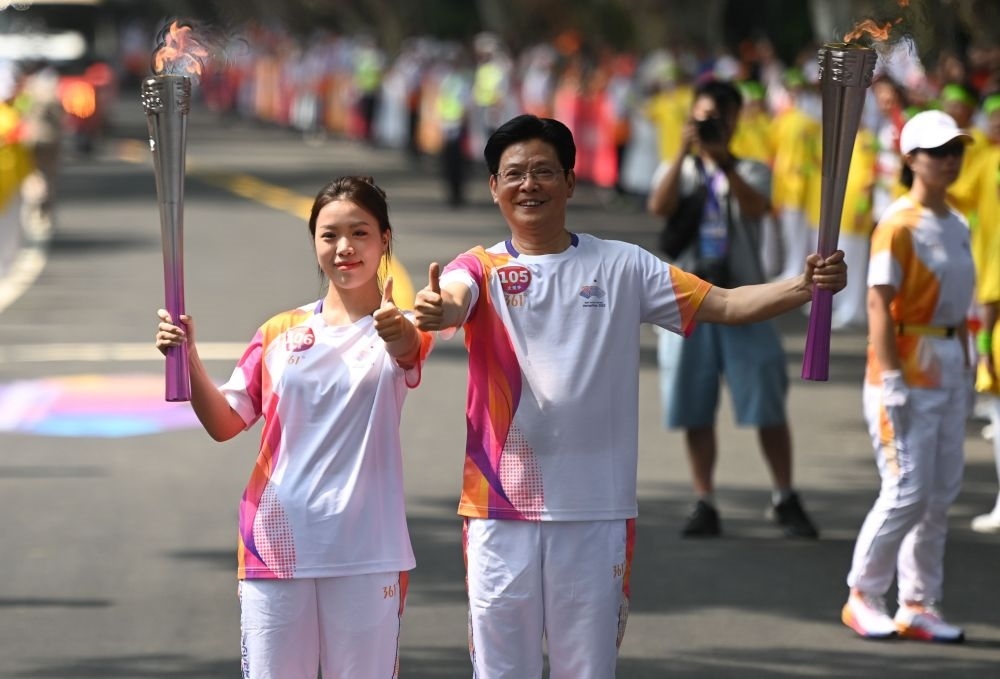 ↑火炬手瞿逢重(右)和馮潔在火炬?zhèn)鬟f中。