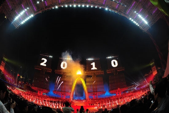 2010年11月12日,廣州,第十六屆亞運(yùn)會(huì)開幕式在海心沙島隆重舉行,圖為主火炬點(diǎn)火儀式。視覺(jué)中國(guó)供圖
