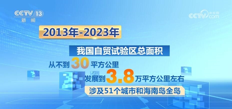 十年間,我國自貿(mào)試驗(yàn)區(qū)的總面積從不到30平方公里發(fā)展到3.8萬平方公里左右,涉及51個(gè)城市和海南島全島。今年上半年,我國自貿(mào)試驗(yàn)區(qū)以不到千分之四的國土面積,實(shí)現(xiàn)了占全國18.4%的外商投資和18.6%的進(jìn)出口總額,帶動(dòng)全國形成了覆蓋東西南北中、統(tǒng)籌沿海內(nèi)陸沿邊的改革開放創(chuàng)新格局。