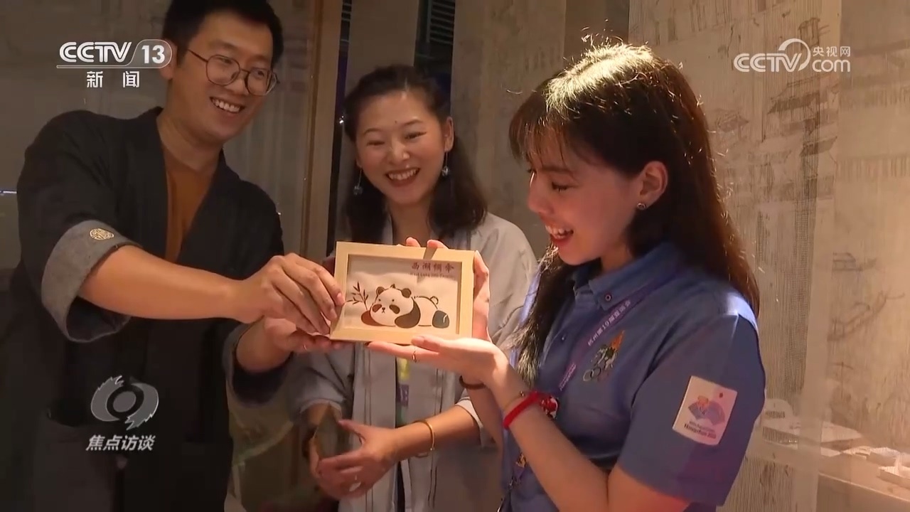 村里的文化市集里同樣熱鬧非凡,竹編、剪紙、皮影戲……每一個(gè)展位面前都圍著不少外國(guó)運(yùn)動(dòng)員。來(lái)自泰國(guó)的擊劍運(yùn)動(dòng)員正在體驗(yàn)綢傘刷花。在刷子涂上顏料,再和絲網(wǎng)進(jìn)行充分摩擦,顏料就會(huì)透過(guò)刻板平鋪在畫(huà)布上,精美的熊貓圖案就做出來(lái)了。當(dāng)?shù)弥@是綢傘上的技術(shù)時(shí),運(yùn)動(dòng)員班提達(dá)十分驚訝。