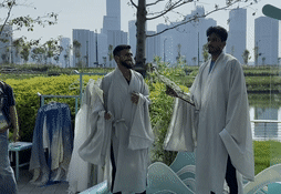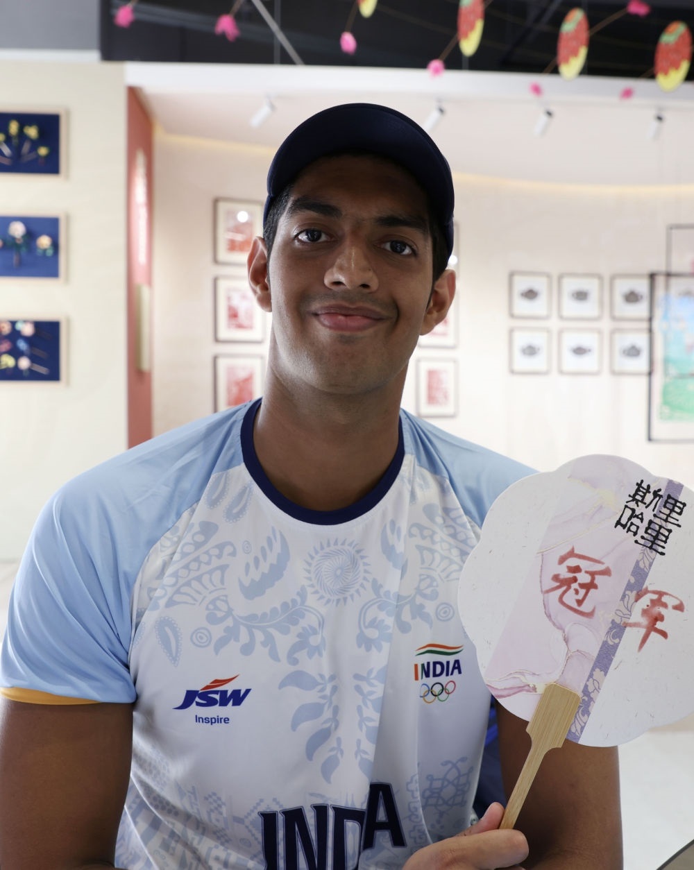 9月29日,馬爾代夫羽毛球運動員穆罕默德·阿杰凡·拉希德(左)在亞運村樂活集市與工作人員合影留念。