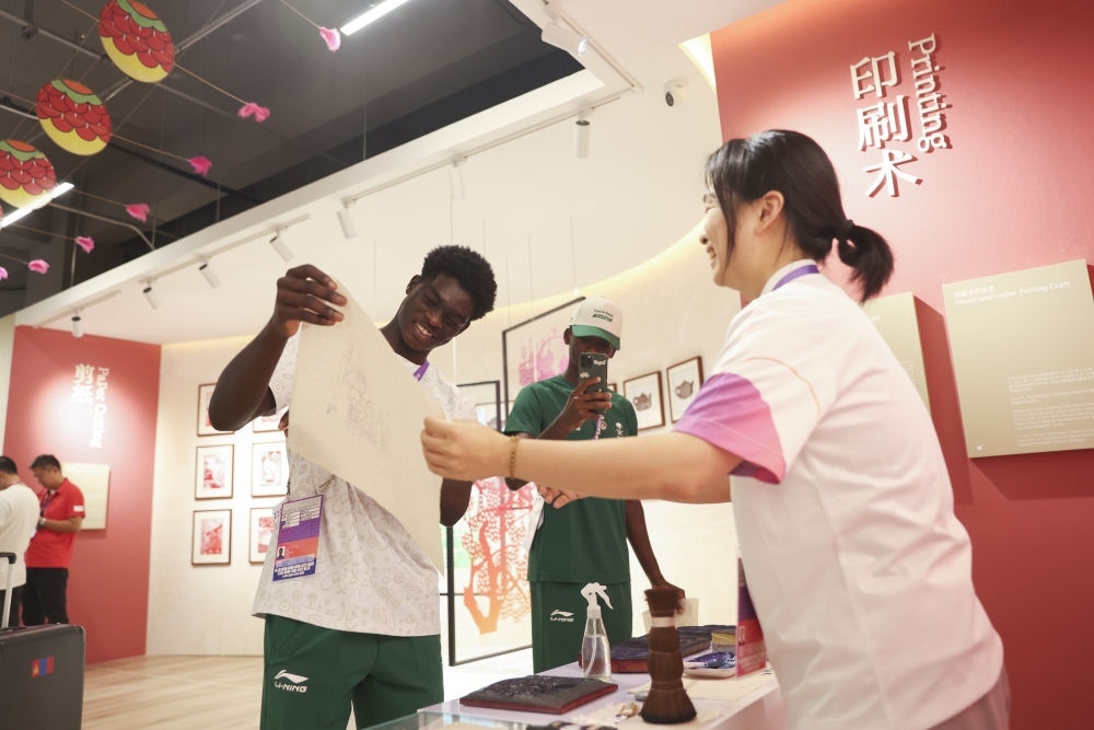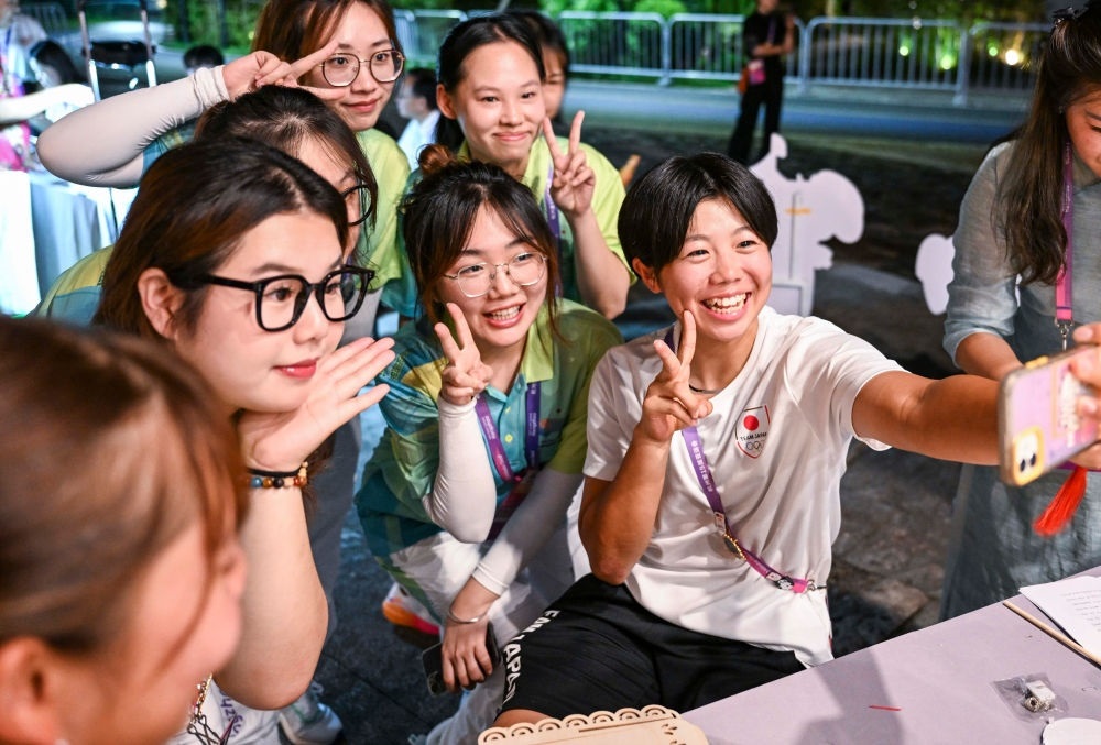 9月25日,一名日本運動員(右)在淳安賽區(qū)傳統(tǒng)工藝體驗坊和志愿者合影。