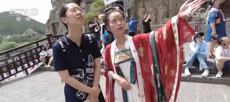 ?????? 記者 徐倩:在龍門石窟,我發(fā)現(xiàn)一個(gè)很特別的點(diǎn),往年來這里,都是導(dǎo)游來陪大家一起逛龍門石窟、來講解。今年的導(dǎo)游做了一個(gè)服務(wù)升級(jí),會(huì)穿著這種比較有特色的唐裝。