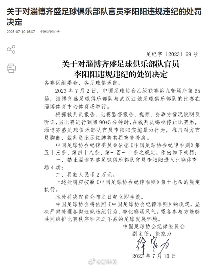·中國足協(xié)再開罰單,兩名俱樂部官員因違規(guī)違紀(jì)被罰。