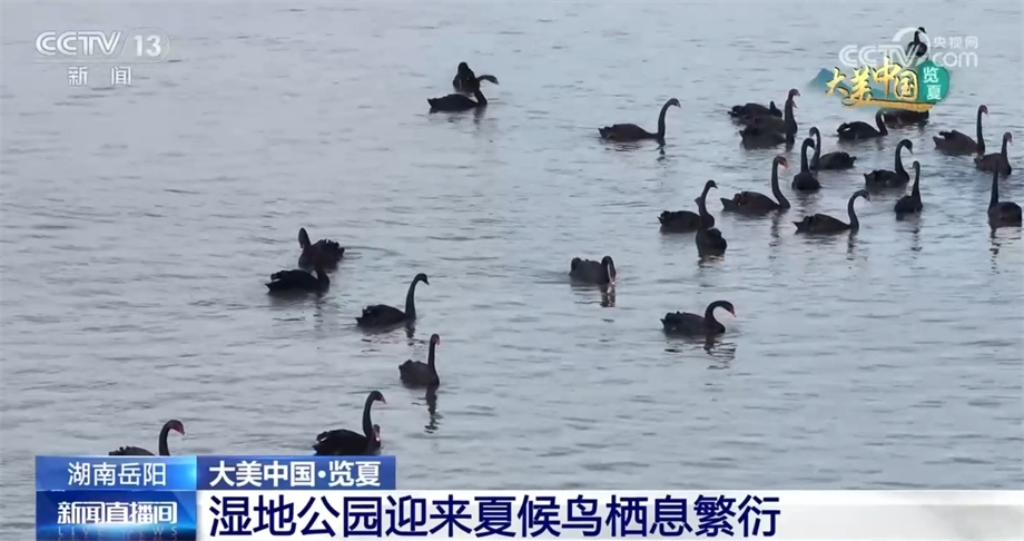 時(shí)值盛夏,湖南岳陽(yáng)湘陰的洋沙湖-東湖國(guó)家濕地公園引來(lái)大批夏候鳥(niǎo)來(lái)此棲息繁衍。碧波蕩漾、清荷搖曳,黑天鵝在此嬉戲覓食,麋鹿閑庭信步、悠然自得。
