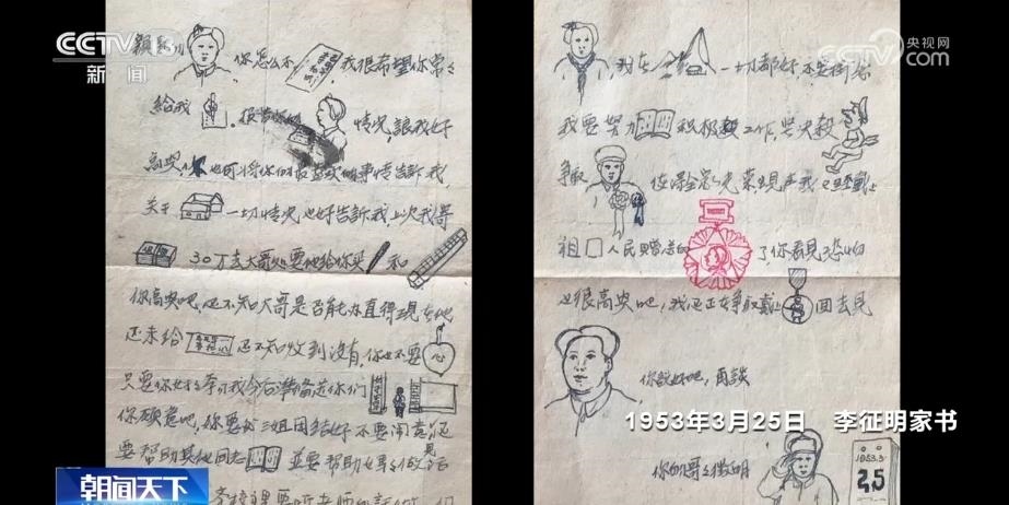 在戰(zhàn)火紛飛的年代,從戰(zhàn)場(chǎng)輾轉(zhuǎn)寄出的家書(shū)有很多很多。其中,有這樣一封特別的信,兩座小山包代表“上甘嶺”、一本書(shū)表達(dá)“讀書(shū)”、妹妹是一個(gè)戴著紅領(lǐng)巾的可愛(ài)小姑娘。泛黃的紙上,是充滿(mǎn)關(guān)切的文字和有愛(ài)的插畫(huà)。