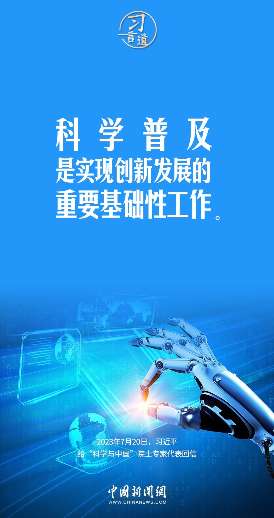 中共中央總書記、國家主席、中央軍委主席習(xí)近平7月20日給“科學(xué)與中國”院士專家代表回信,對科技工作者支持和參與科普事業(yè)提出殷切期望。他指出——