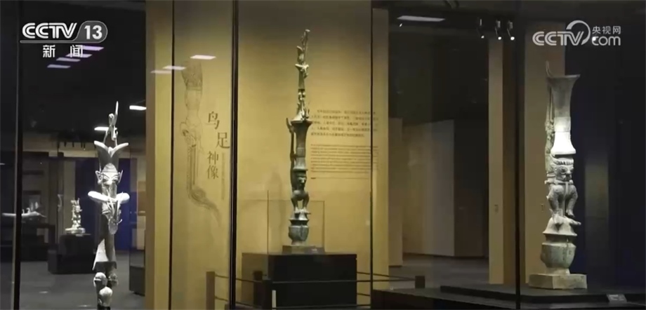 時(shí)隔37年再聚首 三星堆博物館新館再現(xiàn)完整倒立鳥(niǎo)足頂尊神像