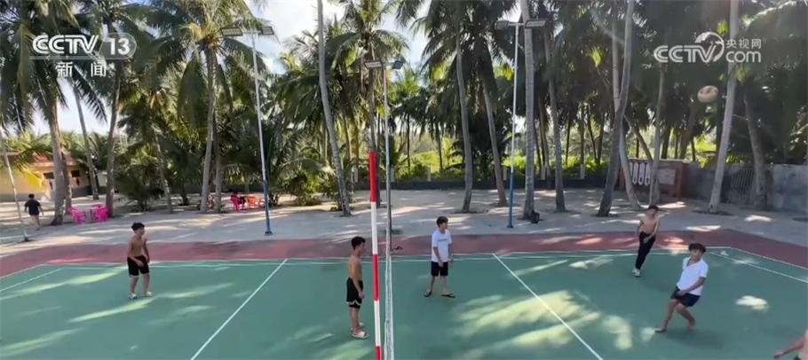 這塊掩映在椰林中的球場,是文昌市東郊鎮(zhèn)椰海村排球場,這是一塊標準大小的場地,球網(wǎng)、邊線一應俱全。傍晚時分,天氣還比較炎熱,球場上已經(jīng)有不少孩子在打球。