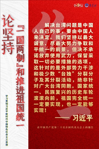解決臺灣問題、實現(xiàn)祖國完全統(tǒng)一,是中國共產(chǎn)黨矢志不渝的歷史任務(wù),是全體中華兒女的共同愿望,是實現(xiàn)中華民族偉大復興的必然要求。必須堅持貫徹新時代黨解決臺灣問題的總體方略,牢牢把握兩岸關(guān)系主導權(quán)和主動權(quán),堅定不移推進祖國統(tǒng)一大業(yè)。