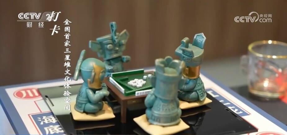 成都臺記者 劉然然:大家看我手中拿著的銅人,是按照三星堆博物館中的青銅人首鳥身像藏品復刻的。無論是造型還是材質,都盡量做到和館藏一致。這里是三星堆博物館官方授權的全國首家體驗空間。