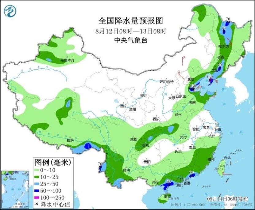 降雨預(yù)報(bào):11日下午至13日,遼寧、吉林、黑龍江等地部分地區(qū)有大到暴雨,局地有大暴雨;大部地區(qū)累計(jì)雨量30~80毫米、局地100~150毫米,遼寧東部局地將超過200毫米。具體預(yù)報(bào)如下: