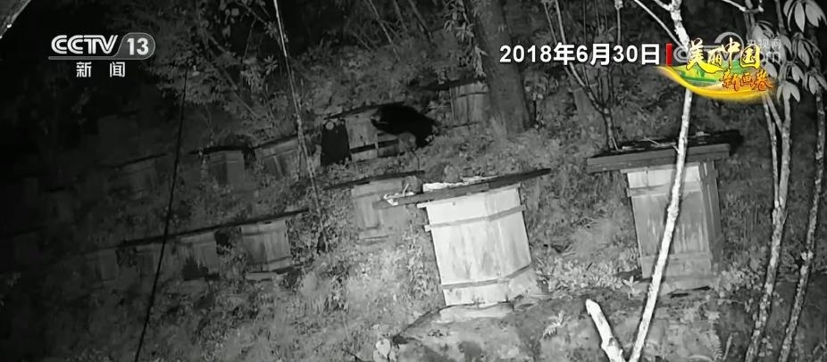 在湖北堵河源國家級自然保護(hù)區(qū),經(jīng)常會發(fā)生黑熊下山偷食百姓的莊稼、蜂蜜等農(nóng)產(chǎn)品。記者通過當(dāng)?shù)匾晃淮迕裉峁┑囊曨l看到,2018年晚上一頭成年黑熊來到一蜂箱放置點,黑熊為了取食蜂蜜推倒了一箱蜂箱,并啃食了幾口蜂蜜。
