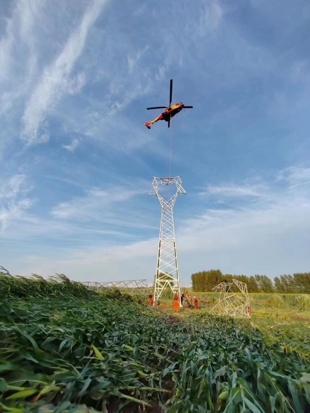 9日,在海林市110千伏長海輸電線路搶修現(xiàn)場,一架直升機吊裝起沉重的輸電鐵塔,運送到指定地點。這個輸電鐵塔處于河流中心島位置,無法使用常規(guī)起重設(shè)備。國家電網(wǎng)公司迅速從國網(wǎng)遼寧電力、國網(wǎng)空間技術(shù)公司等單位調(diào)配直升機支援黑龍江,解決輸電鐵塔吊裝、運輸?shù)葐栴}。