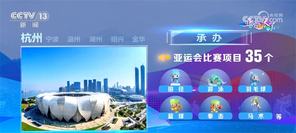 總臺央視記者 任梅梅:杭州亞運會共設置了8個競賽場館群和7個一館多項場館,來提高場館利用效率,使運動員參賽更加便捷。此外,還廣泛使用新科技、新工藝、新材料,將綠色低碳理念融入到競賽場館的設計和運營中,務求打造首屆碳中和亞運會及亞殘運會。目前,亞運村和亞運分村已具備入住條件,賽事場館的各項準備工作也正在全面、有序地推進當中。
