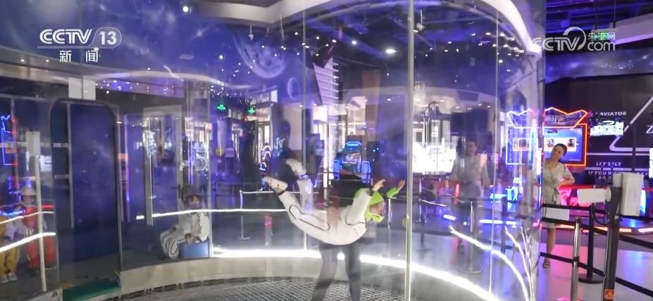 腹部朝下、身體張開、雙腿繃直,在完成這樣一個標(biāo)準(zhǔn)的飛行動作后,就可以在這個空洞中平穩(wěn)飛升到10多米高的空中,模擬體驗跳傘的感覺。